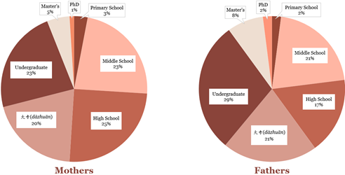 Although the sample population does include diversity in terms of age and education, the majority were young, well-educated, and grew up in urban areas, with 72% falling between 18-25 years of age and 59% of the sample already having obtained an undergraduate degree. In terms of upbringing, 83% of respondents grew up in urban areas, while 17% were raised in rural villages. Currently, 94% of participants reside in urban areas of China, with the remaining 6% living in rural regions. Since this study focuses on parental reception of transgender identities, participants were also surveyed on their parents’ upbringing and education and reported that 62% of both mothers and fathers were raised in urban areas while 38% grew up in rural areas. As for education, 51% of respondents reported that their mother’s highest level of education was high school or less. Fathers received more education, with only 40% of fathers in this group. The chart below shows a detailed breakdown of parental education by gender. Note that 大专 (dàzhuān) does not have an exact equivalent in the US; it is a post high school diploma program that usually lasts two to three years.